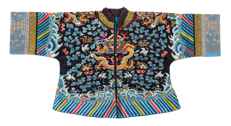 embroidered with gold five-clawed dragons on a blue ground amid ruyi-shaped clouds, bats, cranes and the bajixiang, all above foaming waves crashing against a mountain and the lishui border.