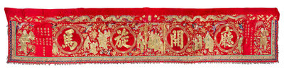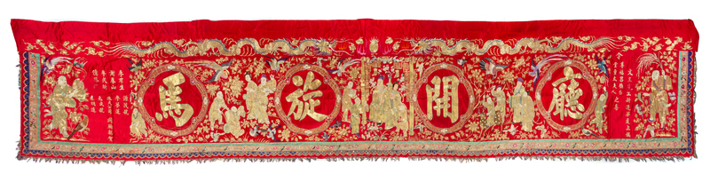 couched in gold-wrapped threads with roundels enclosing characters, the roundels separated from each other by figures of the 'Eight Immortals', all surrounded by auspicious objects and floral scrolls, one end embroidered with dedication from the donor, the lower edge with a tasseled fringe.