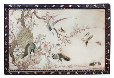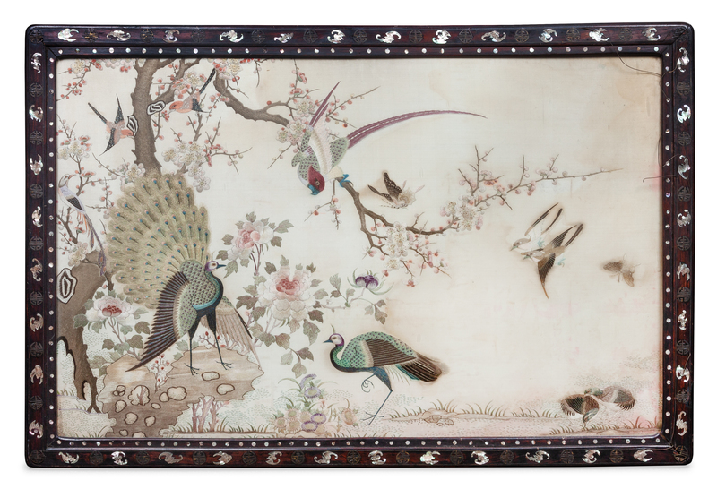 of rectangular form, finely embroidered to show two peacocks, a pheasant, a pair of quails, a pair of butterflies and various birds in flight amongst flowering prunus trees, peony blossoms and rockwork, mounted in a large mother-of-pearl inlaid rosewood frame decorated with bats and metal mounts.