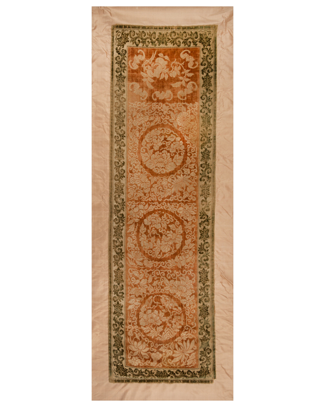woven in polychrome with three similar roundels comprised of clouds and floral scrolls, all against a apricot ground with beige and olive-green borders.