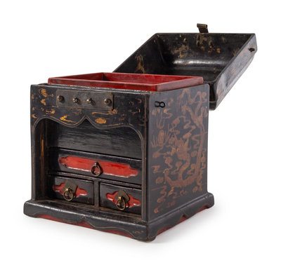 with a rectangular domed cover opening to a shallow tray, opening at the front to reveal one long drawer and two short drawers, gilt to the sides with dragon motifs, with original metal mounts.