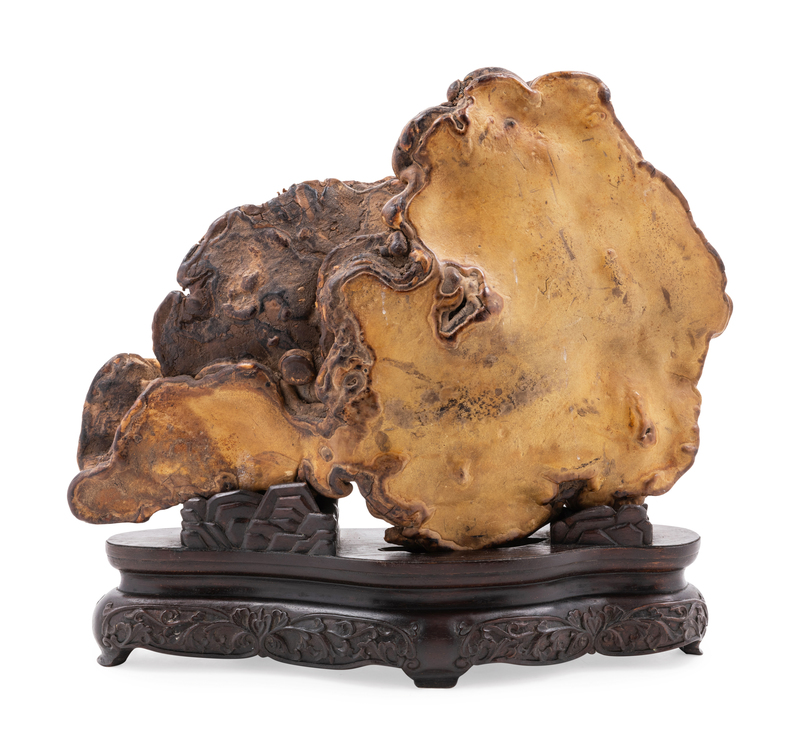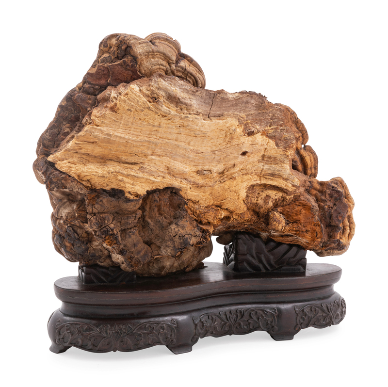 stand on its short stems, the large dried natural fungus head spreading out in a lobed outline, both sides with uneven surface subtly accentuated with organic ridges, with fitted wood stand.