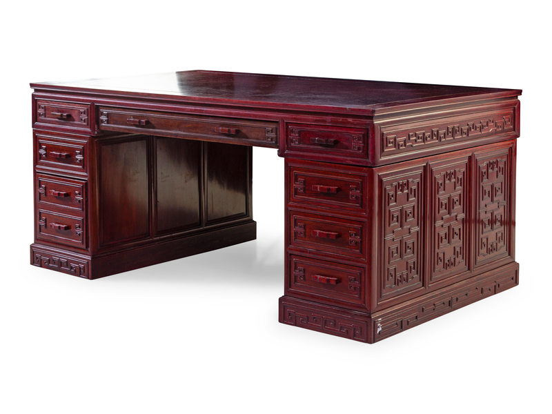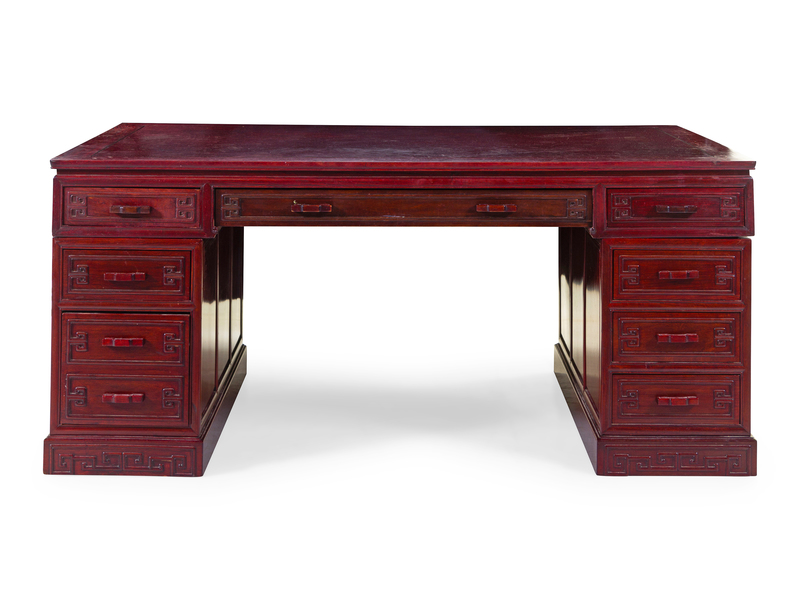 with two pedestals, each of four drawers. each drawer carved in low relief with ruyi-head decoration, all supported on base stretchers.
