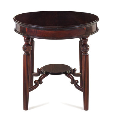 the table has circular top and four sectioned legs, each chair has shaped pierced back and entwined scroll splat, the square seat with waved apron, on cabriole legs joined by an H-stretcher.