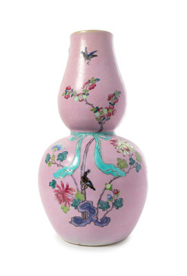 of gourd form, painted with birds with floral blossoms and fruiting branches, the recessed waist painted with a a green ribbon.