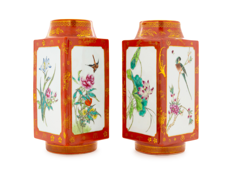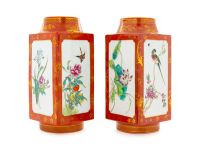 民初 珊瑚紅地描金粉彩花鳥琮式瓶一對