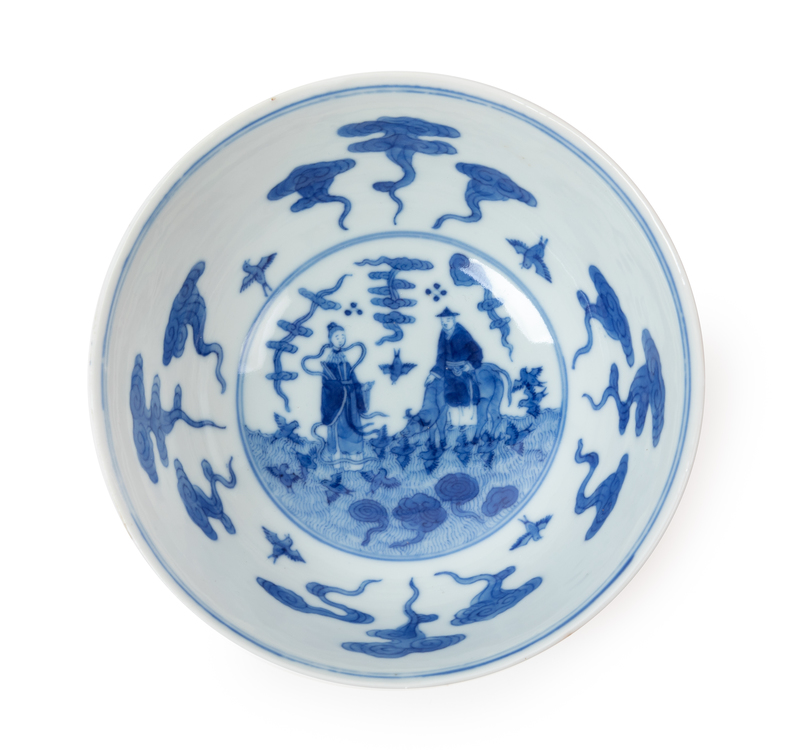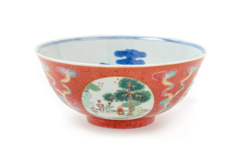 with deep rounded sides rising from a short foot to a slightly flaring rim, the exterior painted with four roundels of various immortals, all surrounded by clusters of clouds reserved against a ruby-red sgraffiato incised ground, the interior painted in underglaze blue with a central medallion enclosing immortals Niu Lang and Zhi Nv enclosed by auspicious clouds and magpies, the recessed base bearing a Daoguang six-character underglaze blue mark and of the period.
