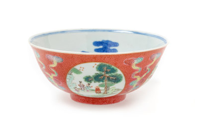 A Ruby-Ground Famille Rose Sgraffiato Porcelain Bowl