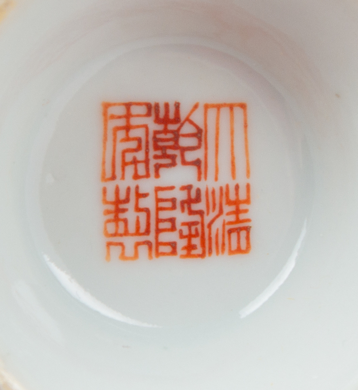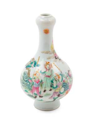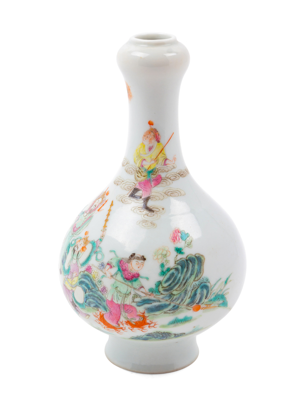 the globular body raised on a tall spreading foot, the elongated neck topped with a garlic-form mouth, painted to the exterior with the Monkey King, Nezha, Li Jing and other warriors, the underside bearing a Qianlong four-character iron red mark.