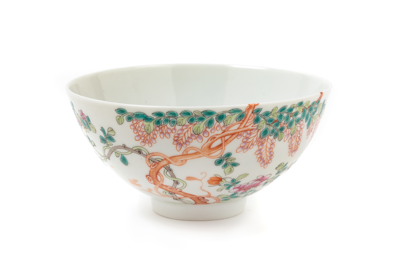 of deep rounded form standing on a short straight foot, decorated around the exterior with sprigs of begonia and wisteria flower among leafy branches, underside bearing a small flower mark.