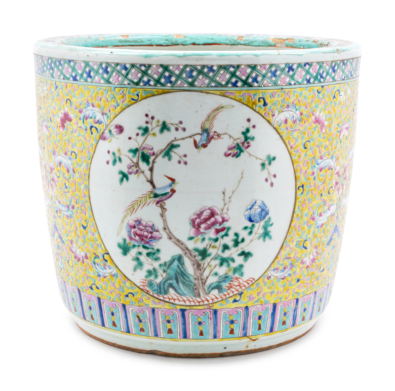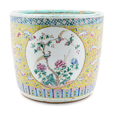 having slightly tapering walls, painted with roundels enclosing birds perched on flowering branches, reserved on a bright yellow ground decorated with multi-colored floral sprigs.
