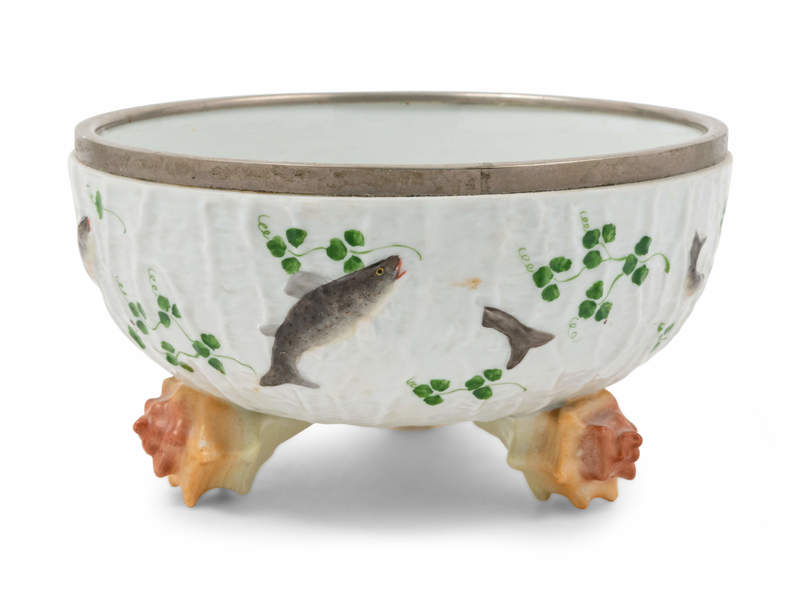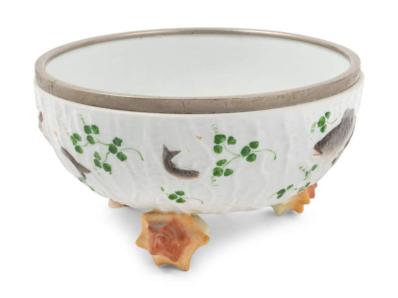 with conch shell form feet, hand painted fish and foliate decoration, in a silver rim mount.