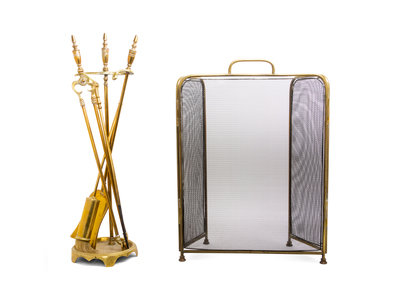 A Group of English Brass or Wirework Fireplace Tools