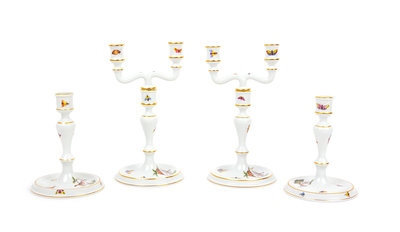 each in the Rothschild Bird pattern, comprising a pair of candlesticks and a pair of convertible two-light candelabra.