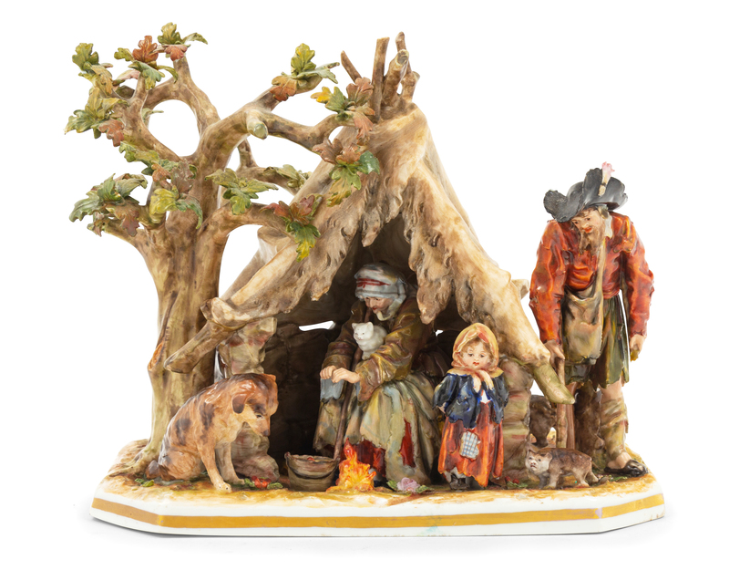 modeled to show a peasant family around a tent, marked in underglaze blue to the underside.