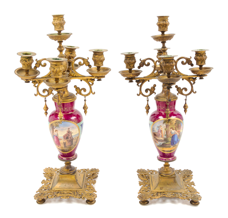 A Pair of Sevres Style Gilt Metal Mounted Five-Light Candelabra