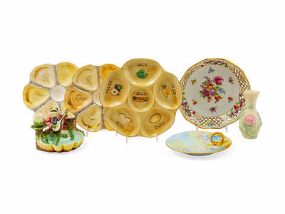 comprising a Seder plate, 2 oyster dishes, bonbon dish, reticulated basked, vase and a butter dish.