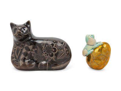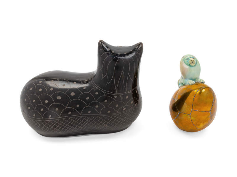 depicting a lion atop an egg, together with an associated unsigned Mexican pottery cat.