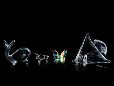 comprising a Baccarat butterfly, Steuben Fish and an unsigned whale and bull example.