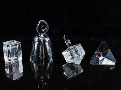 comprising a Daum bell, Steuben paperweight and two glass Judaica articles.