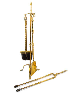 comprising a firescreen, four brass fireplace tools and a pair of andirons.