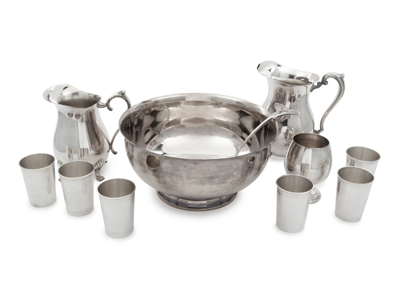 comprising a punch bowl, tea urn, teapot, pitchers, creamer, tumblers and julep cups, 19 items total.