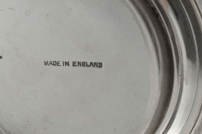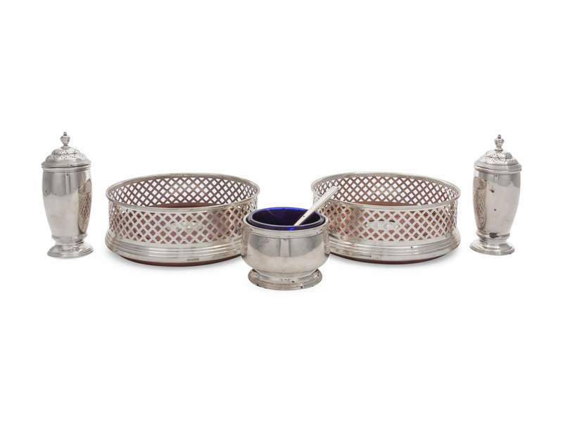 comprising a pair of W.I. Broadway & Co. wine coasters with wood interiors, a pair of C S Harris & Sons Ltd weighted casters and a C S Harris & Sons Ltd salt with cobalt glass liner and spoon.