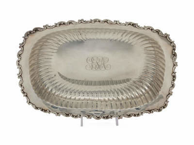the rim decorated with C-and S-scroll foliate elements and having a fluted border and centered with an engraved monogram.