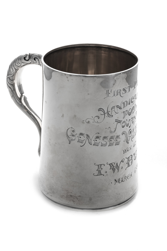 with the engraved inscription First Prize/ Handicap/ Pool/ Tournament/ Genesee Valley Club/ Won By/ E. W. Butts/ March 1890.