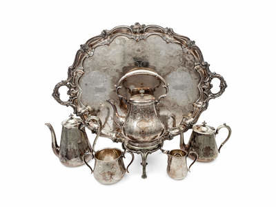 comprising a hot water kettle on stand, a coffee pot, a tea pot, a creamer, a sugar and a tray.