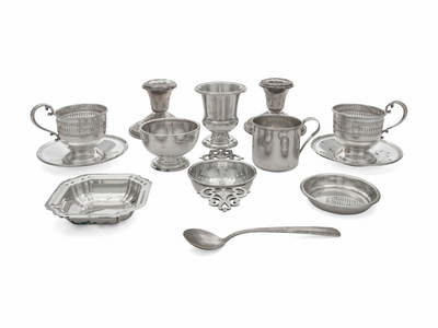 comprising two demitasse cup liners and saucers, a pair of weighted candlesticks, children's cup, toothpick holder, lemon strainer and dish, two butter pats and a sugar spoon.