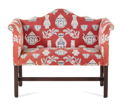 the upholstered back, arms and seat raised on straight legs joined by stretchers.