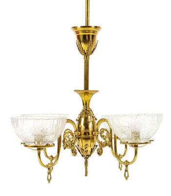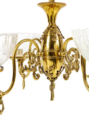 A Victorian Brass and Etched Glass Gasoline Chandelier Converted to Electric
