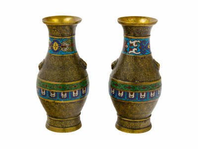 A Pair of Chinese Bronze and Cloisonne Vases