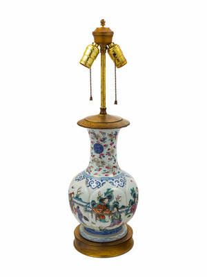 of bottle form with figural decoration, mounted as a lamp