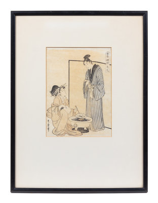 depicting an interior scene with two figures cooking, artist signed, matted and framed.