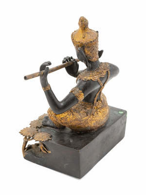 A Thai Gilt and Patinated Bronze Flute Player