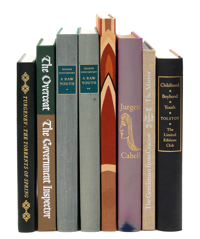 CABELL, James Branch. Jurgen, A Comedy of Justice. 1976. LIMITED EDITION, number 1,493 of 2,000 copies. -- DOSTOEVSKY, Feodor. A Raw Youth. 1974. 2 volumes. LIMITED EDITION, number 1,493 of 2,000 copies. -- FINNEY, Charles G. The Circus of Dr. Lao. 1982. LIMITED EDITION, number 1,493 of 2,000 copies. -- GOGOL, Nikolai. The Overcoat and The Government Inspector. 1976. LIMITED EDITION, number 1,493 of 2,000 copies. -- SINGER, Isaac Bashevis. The Gentleman from Cracow. 1979. LIMITED EDITION, number 1,493 of 2,000 copies. -- TOLSTOY, Leo. Childhood, Boyhood, Youth. 1972. LIMITED EDITION, number 1,500 of 1,500 copies. -- TURGENEV, Ivan. The Torrents of Spring. 1976. LIMITED EDITION, number 1,493 of 1,600 copies. -- With 9 others. Together 16 works in 18 volumes, publisher's bindings, condition generally fine, complete list available on request.