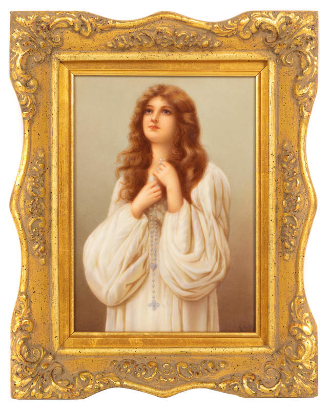 depicting a maiden with a rosary, set in a giltwood frame.