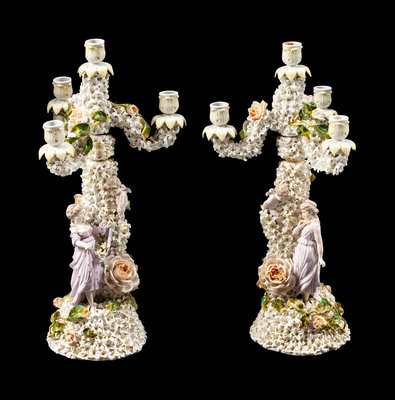 A Pair of German Porcelain Schneeballen Figural Four-Light Candelabra