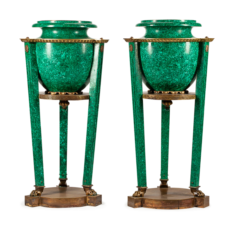 A Pair of Russian Neoclassical Gilt Metal Mounted Malachite Veneered Urns