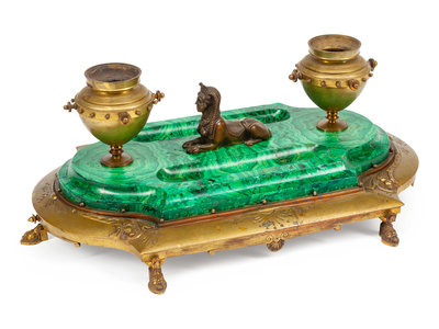 An Egyptian Revival Gilt Bronze and Malachite Veneered Inkwell