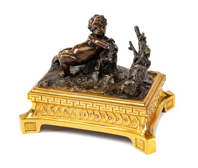depicting a boy and a goat, raised on a later gilt bronze base.
