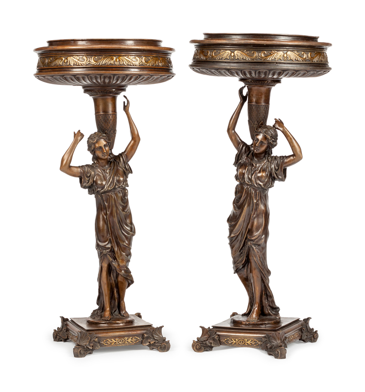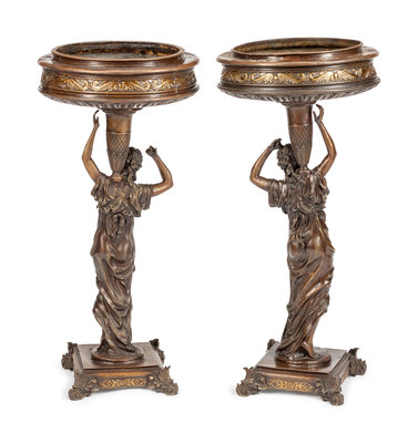 A Pair of Continental Patinated Bronze Figural Jardinieres