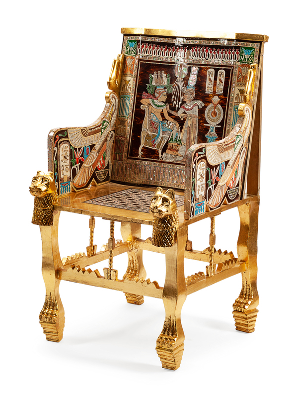 An Egyptian Revival Painted, Parcel Gilt and Inlaid Throne Chair