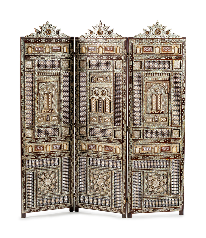 A Moorish Style Mother-of-Pearl and Bone Inlaid Three-Panel Screen