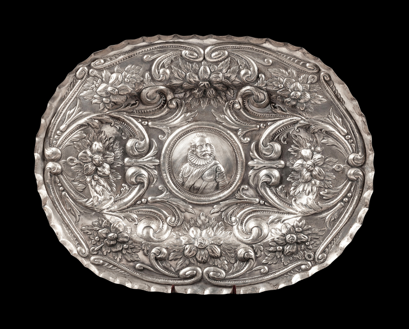 with C-scrolls enclosing repousse floral sprays centered by a portrait of a gentleman in armor.