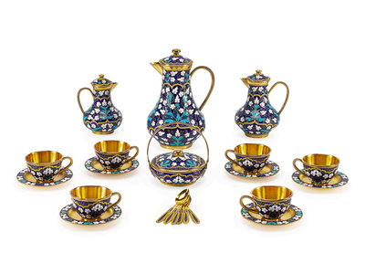 comprising a coffee pot, hot water pot, creamer, covered sugar, 6 teacups, 6 saucers and 6 spoons; 22 items total.