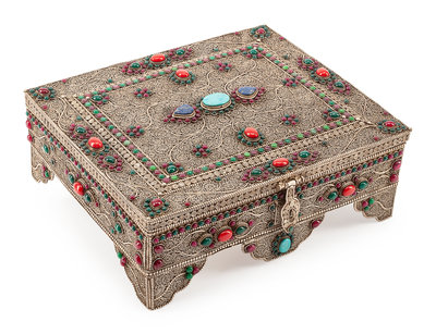 A Silver Filigree, Turquoise, Ruby and Enamel Box