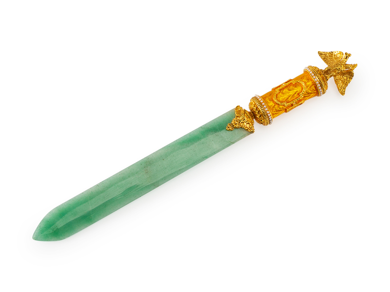 A Russian Enameled Gilt Metal and Jadeite Paper Knife